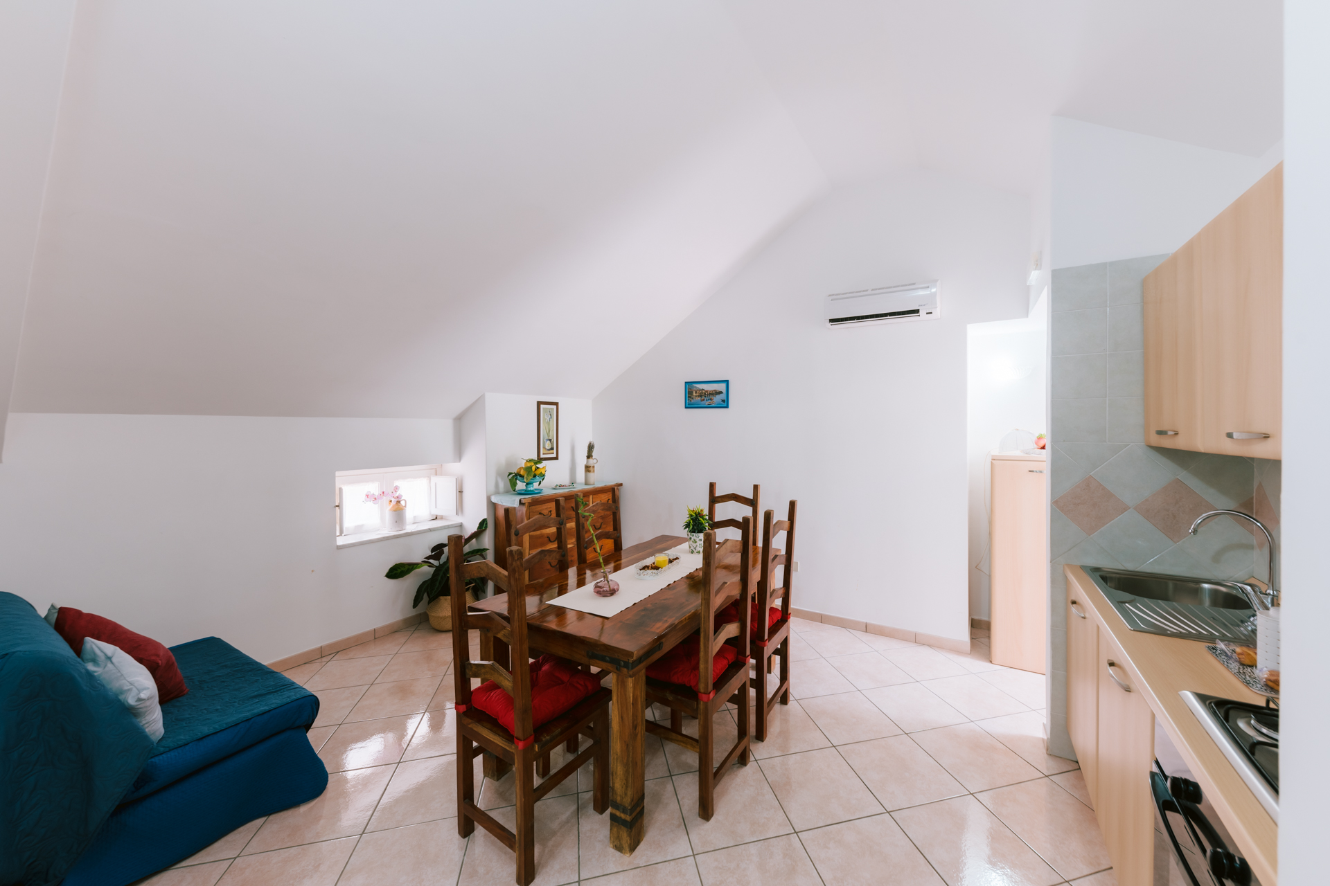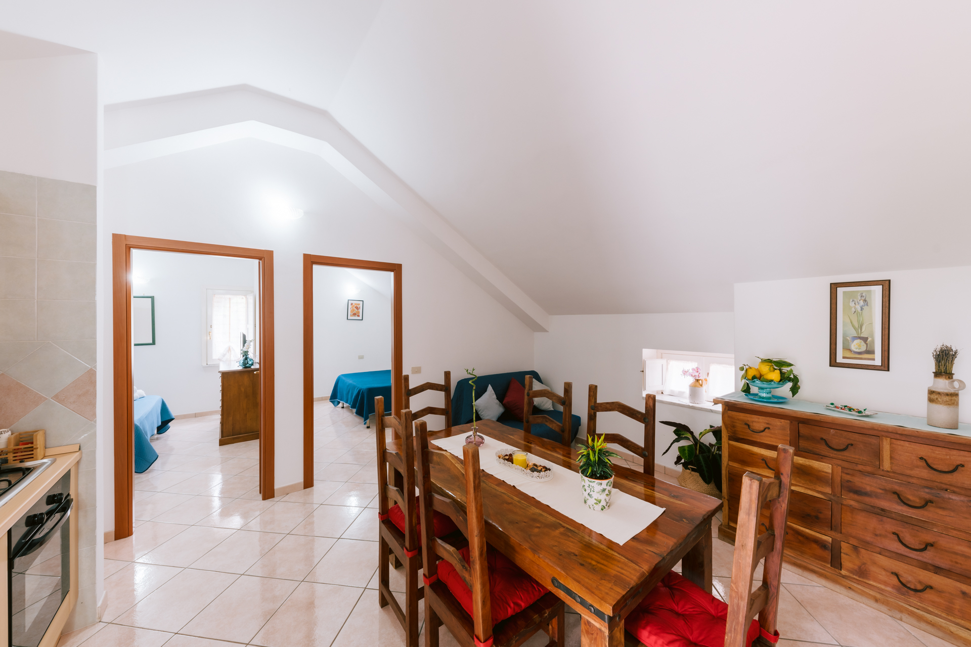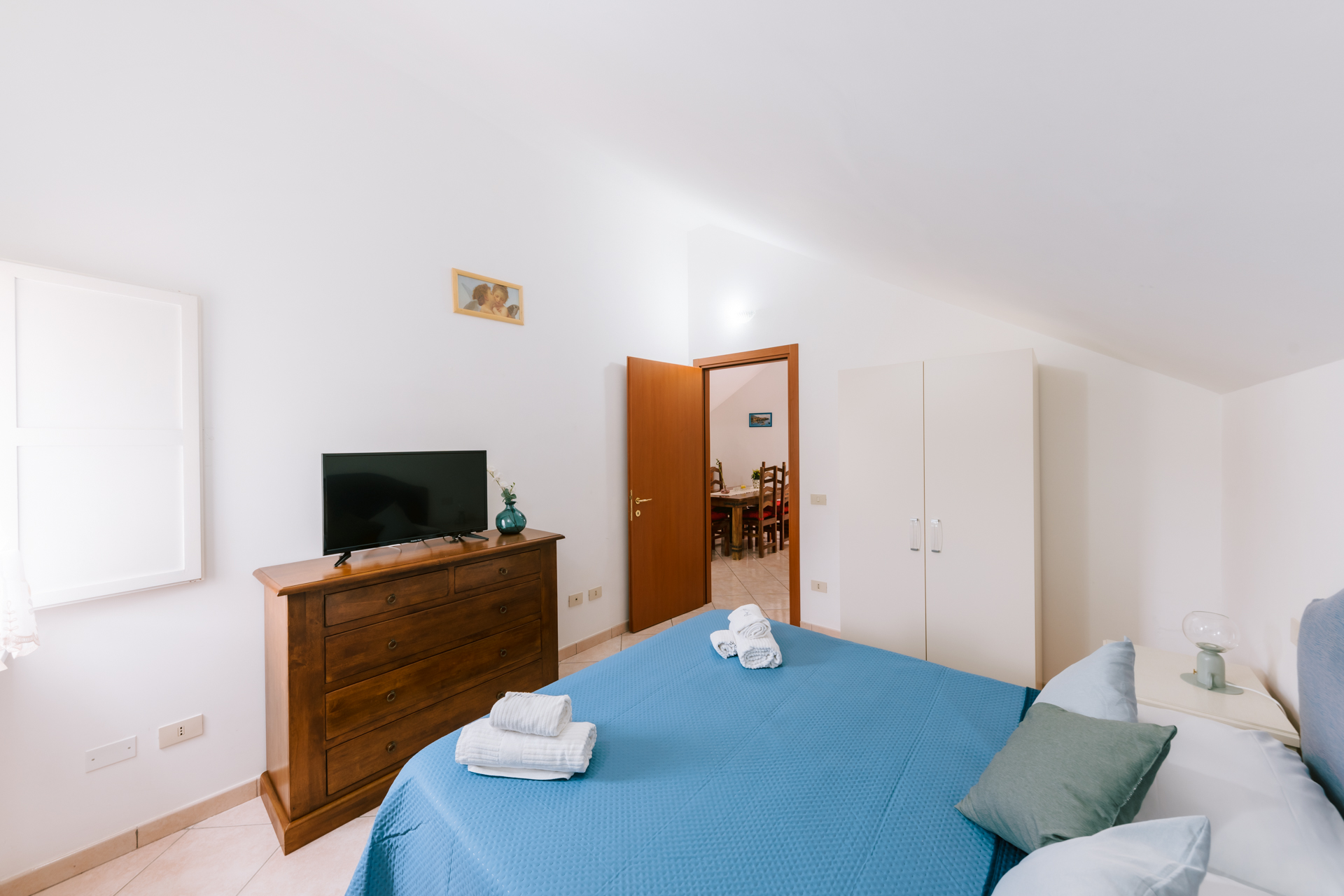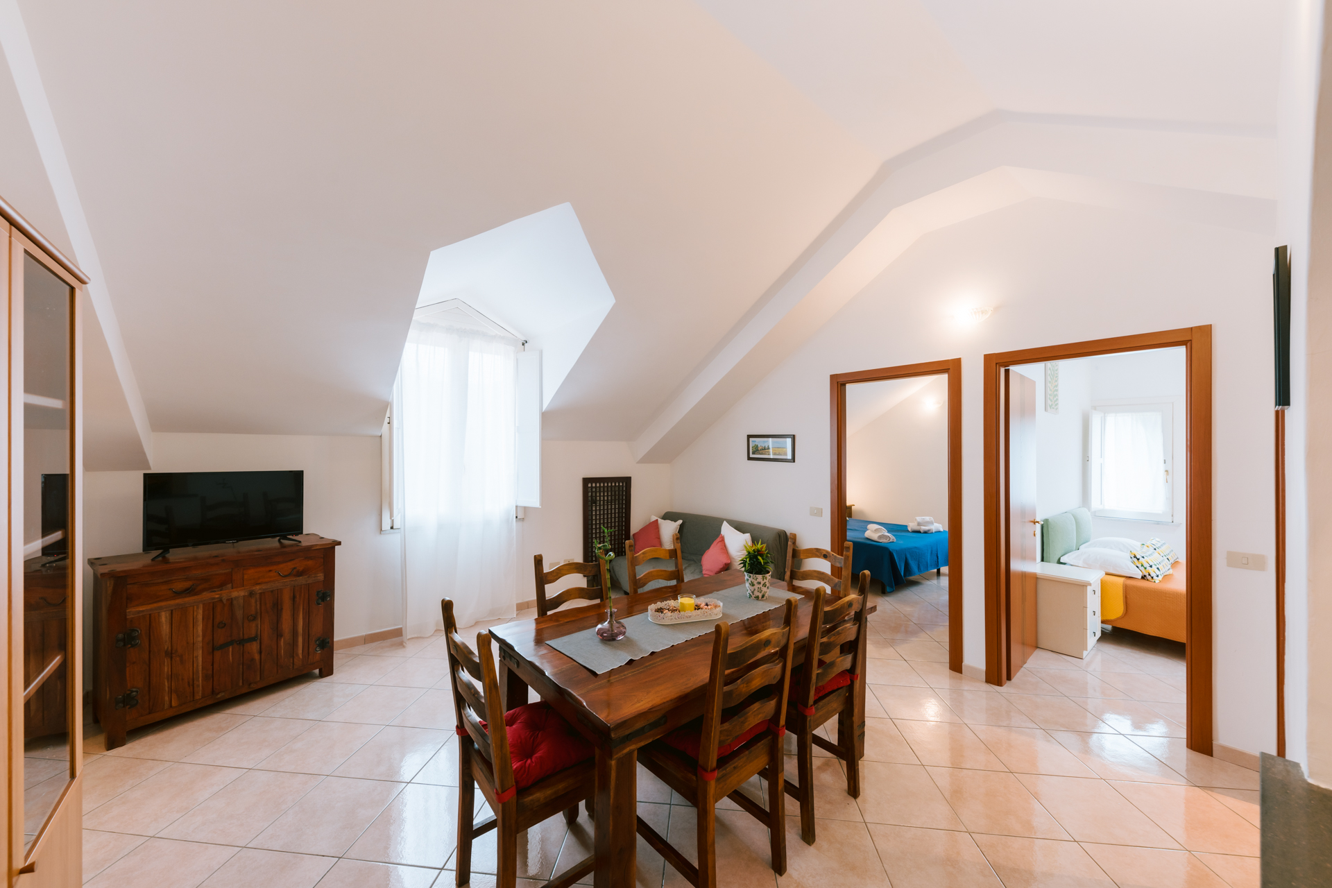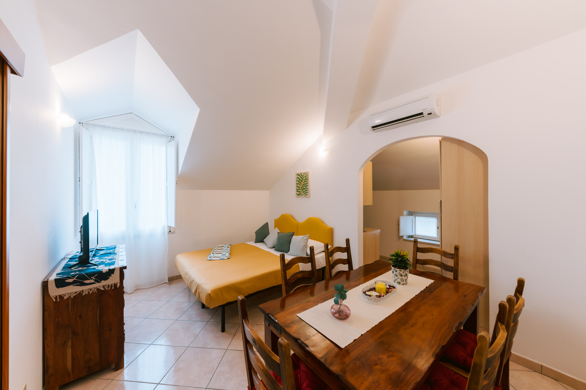 Camera da letto con un letto matrimoniale più un letto singolo e un divano letto matrimoniale nel soggiorno cucina.